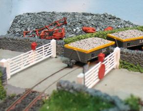 Remains of an old slate quarry, whose waste tip reached to the railway's level crossing with its typical gates.