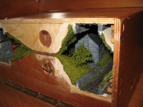 The station building (shown here with its wooden substructure) stands above the parting point above the hinge. The roof swings aside, thus releasing the hinge for movement.