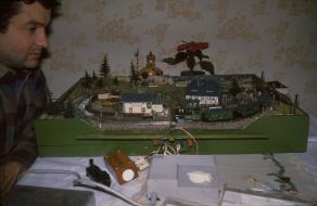 Picture on right: Hans Schellenberg with his suitcase layout Scale H0e, 3,5 mm, gauge 9mm