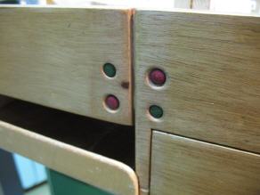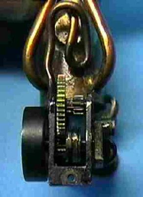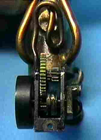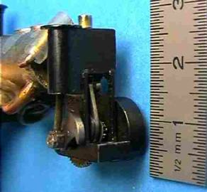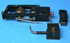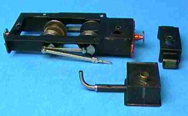 The point levers on right, on left the contacts which connect both halves of the suitcase electrically (phosphor bronce strips).